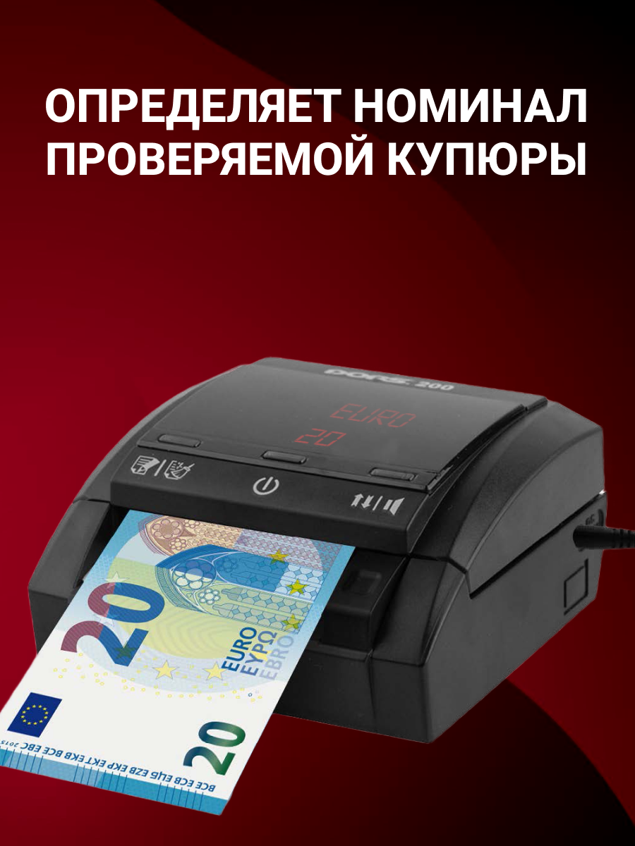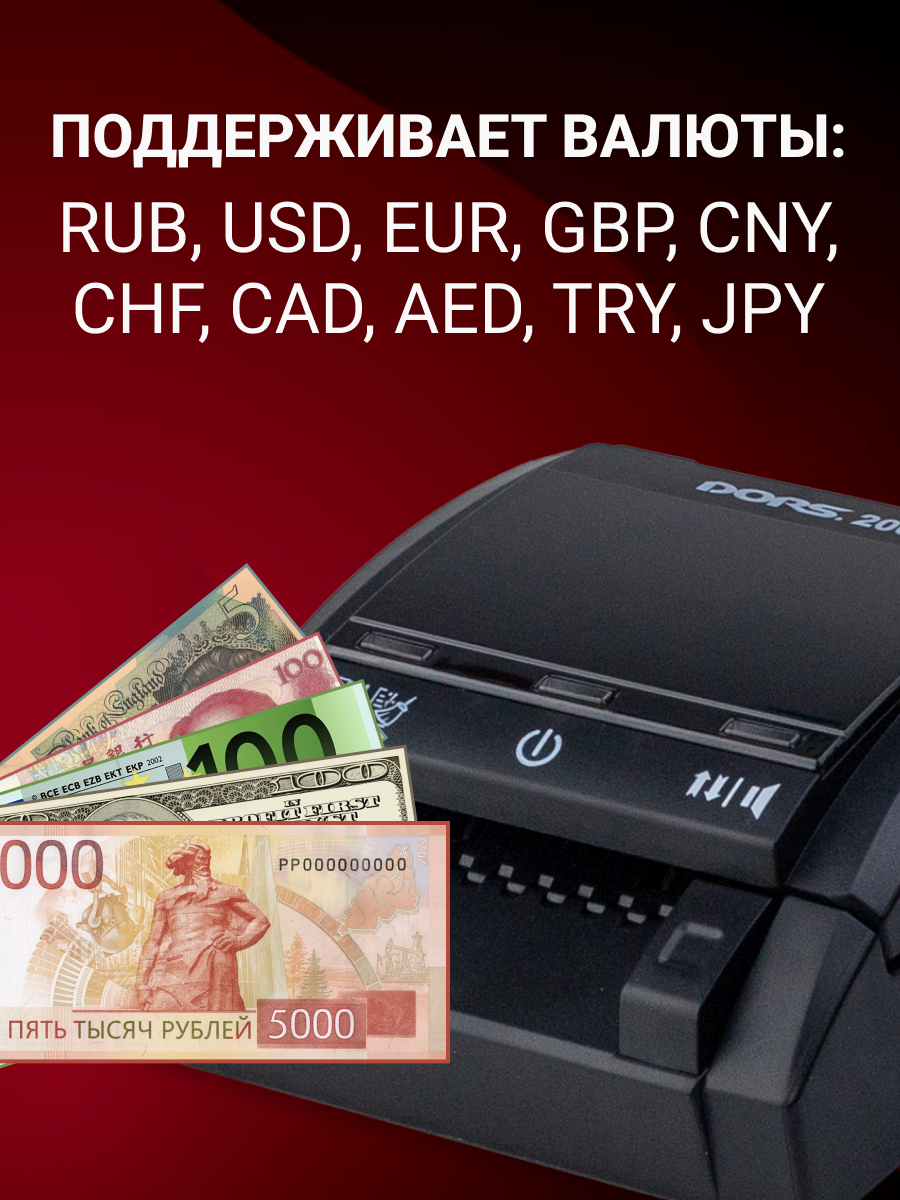 Восемь видов детекции: DORS 200 MULTI распознаёт подлинность купюр 10 валют — рублей, долларов США, евро, фунтов, юаней, турецких лир, японских иен, швейцарских франков, канадских долларов и дирхамов ОАЭ — любых номиналов и мгновенно отображает результат на экране.