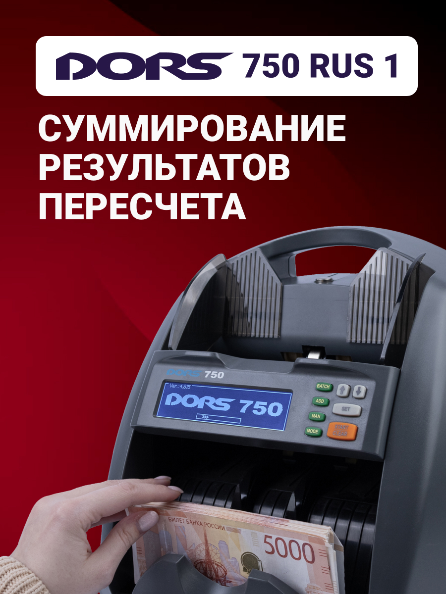 DORS 750 позволяет вести подсчет несортированной пачки рублей разных номиналов, с возможностью вывода на экран данных о том, сколько было подсчитано купюр каждого конкретного номинала. В случае попадания фальшивой банкноты DORS 750 останавливается с возможностью продолжения подсчета после ее изъятия.