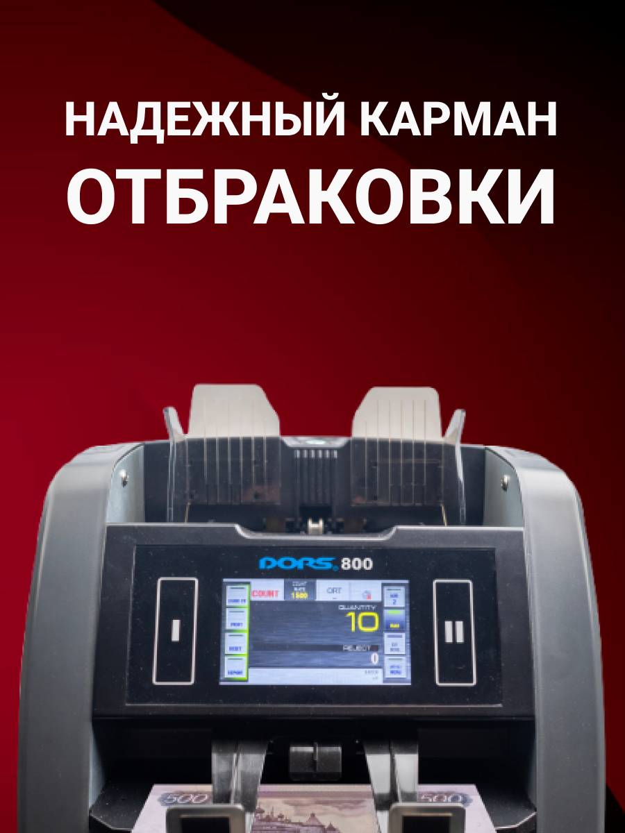 DORS 800 RUS1 — двухкарманный счетчик-сортировщик банковского класса. Счетчик оснащен детектором банкнот и определяет подлинность наличных по девяти признакам. DORS 800 RUS1 прошел проверку в ЦБ России по четырем машиночитаемым признакам подлинности рублей.