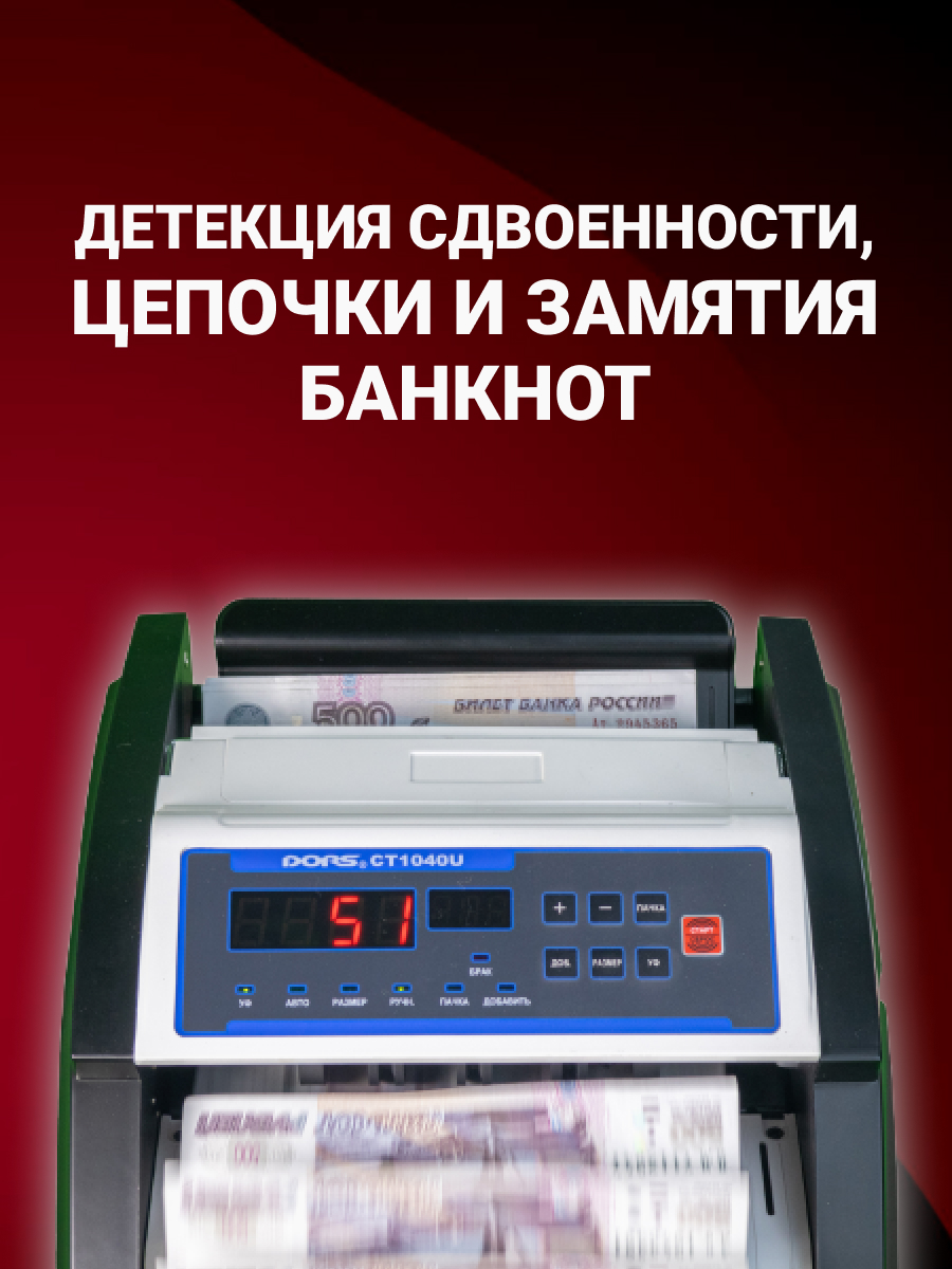 Чтобы избежать ошибок при счете, DORS CT1040U определяет наслоившиеся друг на друга банкноты.