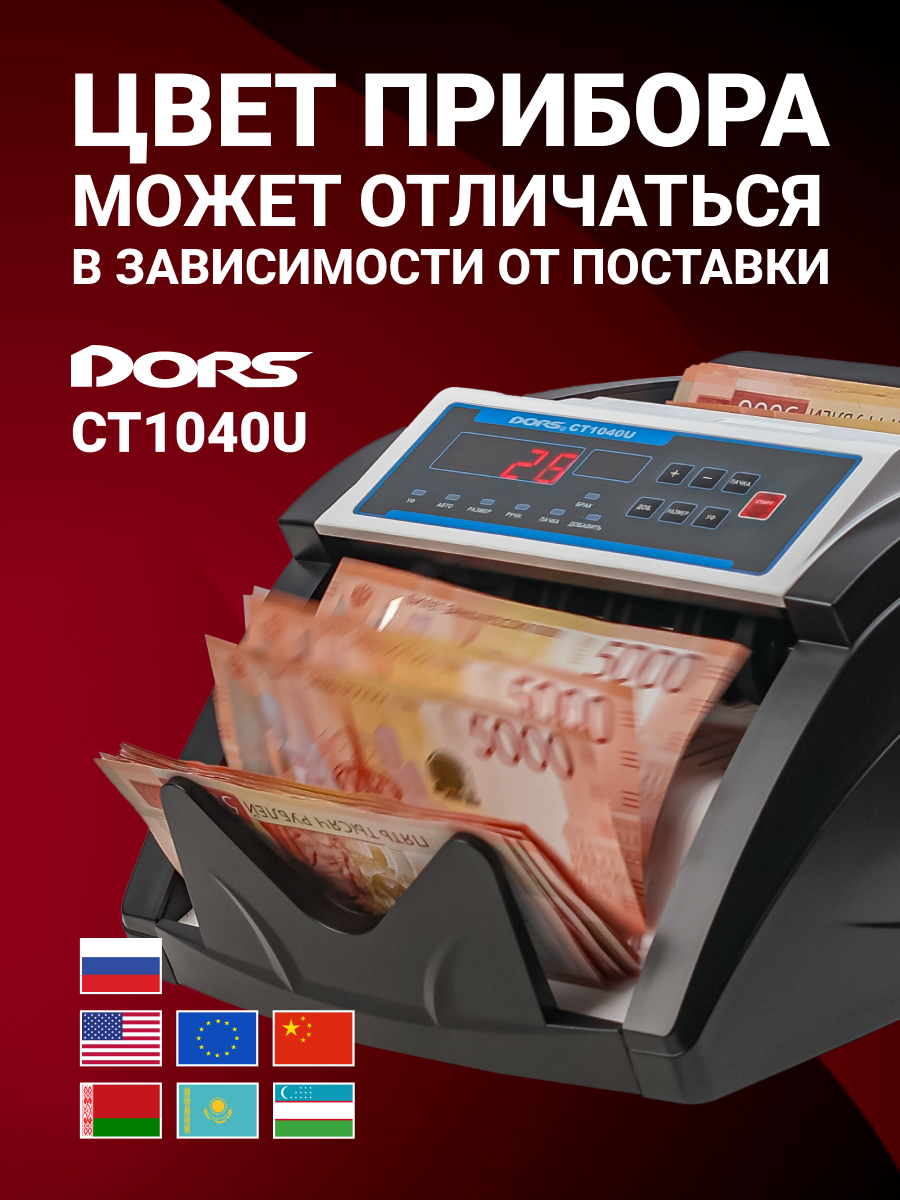 Счетчик банкнот DORS CT1040U успешно работает как с рублями всех номиналов, выпущенные в разные годы, включая с купюры 5, 10 и новые 100, 200 и 2000 рублей, так и другими валютами мира.